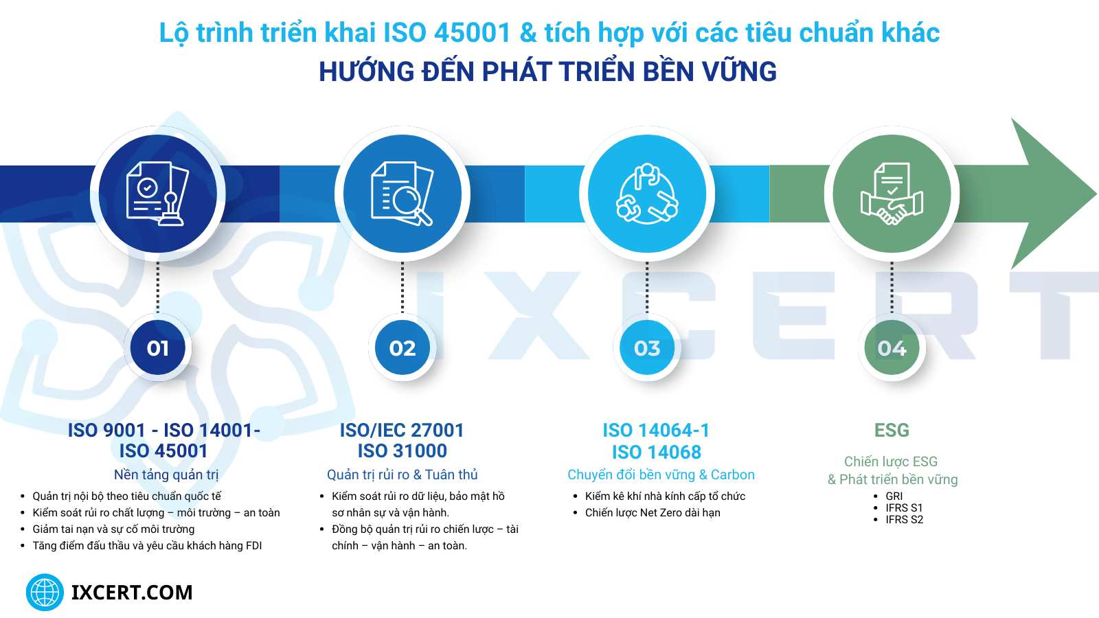 ISO 45001 là tiêu chuẩn quốc tế về Hệ thống quản lý An toàn & Sức khỏe nghề nghiệp (OHSMS), được ban hành bởi ISO năm 2018, thay thế cho OHSAS 18001. Tiêu chuẩn này giúp doanh nghiệp phòng ngừa rủi ro, bảo vệ người lao động và nâng cao hiệu quả vận hành.